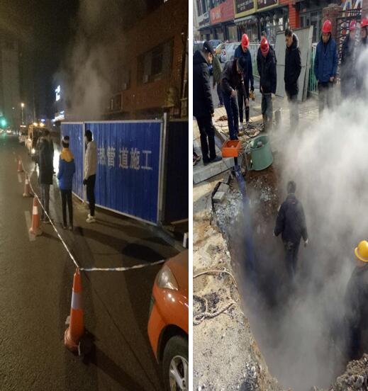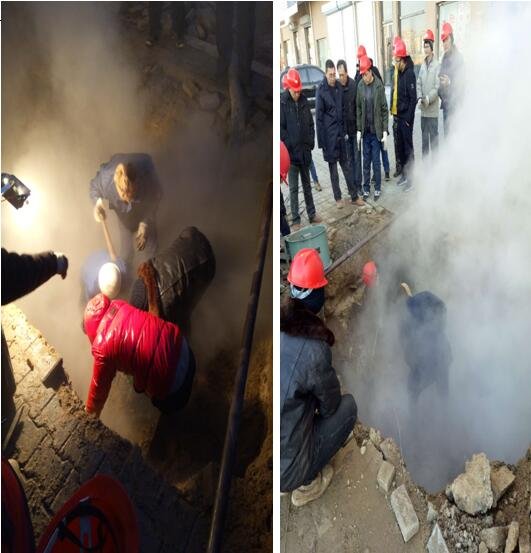 1月16日晚上九點多,站員在巡站過程中發(fā)現(xiàn)東亞二北墻外人行道路面有滲水的情況,并且還有熱氣,確定是公司管線,于是打電話上報公司調(diào)度。調(diào)度接到匯報之后立即通知各部門,胡總帶領(lǐng)安全設(shè)備部、生產(chǎn)部及檢修部門緊急趕到現(xiàn)場確認情況,由于漏點不大,且無法調(diào)配挖機。于是立即做立警戒錐、上圍擋等安全防護施,以防止意外情況的發(fā)生,并于次日清晨開始挖掘確認漏點位置。此管線為DN500管線,漏點在管道側(cè)方,漏點處無保溫。由于兩頭閥門無法關(guān)嚴,只能在漏點位置泄水,待壓力減小才能作業(yè)。此次搶修由施工方負責(zé),公司檢修及各部門人員積極配合工作,本次搶修任務(wù)在半夜三點順利完成。