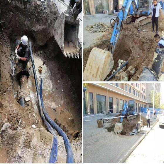7月22日,公司拿到施工確認(rèn)通知單后,檢修部門按公司要求開始對幸福南路與召園路交叉口一次網(wǎng)漏點(diǎn)處進(jìn)行搶修作業(yè)。漏點(diǎn)位于十字路口東南角處的下水井旁邊,在馬路正下方。在機(jī)械破路之后才能開始人工挖掘,工程量相對較大。尤其是管路周邊的不確定性更是給本次作業(yè)增加了相當(dāng)大的作業(yè)難度。破路之后才發(fā)現(xiàn)天然氣管道和電力一根電纜鋪設(shè)在距離我方管線非常近的位置。在這種情況下,施工過程中發(fā)生了一次意外事件,不過好在現(xiàn)場人員應(yīng)對及時,才避免了事態(tài)的進(jìn)一步擴(kuò)大。之后在無機(jī)械設(shè)備的輔助狀態(tài)下,檢修部門全靠人力進(jìn)行管道挖掘。常務(wù)副總劉總?cè)淘诂F(xiàn)場指導(dǎo)工作。
