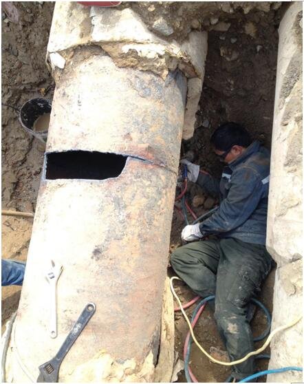 經(jīng)過挖掘機(jī)的處理后發(fā)現(xiàn)是由于黃河大街前年施工時將我公司管道保溫層破壞后,幾年腐蝕出現(xiàn)漏點(diǎn)。經(jīng)過幾天的緊急搶修,破損管路已處理完畢并將裸露部分進(jìn)行了保溫填充。