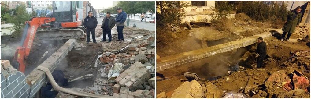 10月14日,鹿港站報(bào)告:鹿港小區(qū)西門北100米二次管網(wǎng)泄漏。此次泄漏二次管網(wǎng)不屬于我公司管轄范圍,但由于管理此管線的所屬物業(yè)已撤走,經(jīng)過(guò)公司與政府主管部門協(xié)商,此次事故搶修任務(wù)由我公司進(jìn)行處理。接到任務(wù)后搶修小組立即調(diào)派挖機(jī)及人員對(duì)現(xiàn)場(chǎng)開始搶修。當(dāng)天對(duì)跑水的故障管線更換完畢,并對(duì)已經(jīng)破壞的管路保溫重新包裹,確保此次搶修任務(wù)不留隱患,保證周圍居民正常安全用熱。