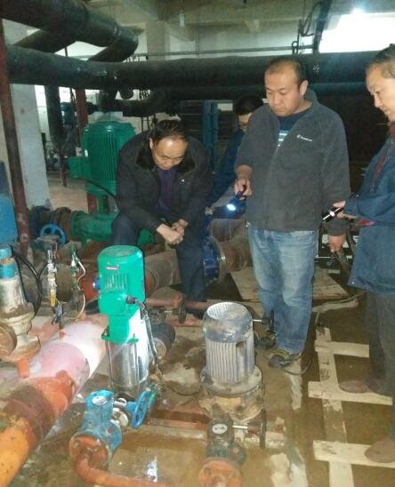 11月16日,曹欣30KW電機(jī)線圈部分維修完畢。安全設(shè)備部將修好線圈取回公司并將育強(qiáng)熱力站內(nèi)排污泵留下進(jìn)行維修。同日松石名第站內(nèi)有一威樂(lè)補(bǔ)水泵不出力經(jīng)過(guò)多次檢修查看未能找到原因。安全設(shè)備部聯(lián)系威樂(lè)廠家到站內(nèi)進(jìn)行查看(右圖)。經(jīng)過(guò)多次排水排氣操作,泵整體出力效果改善,滿足系統(tǒng)運(yùn)行要求。